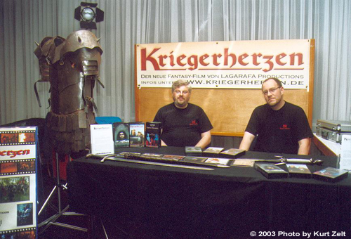 | Als Aussteller auf der "Spiel '03" in Essen 23. - 26. Oktober 2003 Wie jedes Jahr lud der Friedhelm Merz Verlag im Oktober 2003 zur "Spiel '03" nach Essen ein, der Messe für alles und jeden Rund um das Thema "spielen". Ganz anders als in jedem Jahr hatte "Kriegerherzen" dort zum ersten Mal einen eigenen Stand. Hier wurde der entstehende Film und das Team, welches hinter ihm steht, vorgestellt und dem breiten fantasybegeisterten Publikum näher gebracht. Zusammen mit "Curzweyhl", dem Label für fantastische Musik und dem Vertrieb der Firma Mondschatten teilte sich LaGARAFA Productions den Messestand. Und hier wurde das Label Curzweyhl auf die Band "Minotaurus" aufmerksam, die vor kurzem den Titelsong "Warriorhearts" eigens für "Kriegerherzen" (siehe Infos zur Filmmusik HIER) fertiggestellt hatten und von denen die musikalische Untermalung für manche unserer Trailer entstammt. Viele bekannte Gesichter erblickten wir wieder und noch mehr unbekannte Gesichter erblickten die bis zu diesem Zeitpunkt fertigen Trailer, die sogar auf großer Leinwand ohne Unterlass gezeigt wurden. Das Interesse der Leute war groß und nicht wenige wurden vom spannungsgeladenen 'Kriegernerzen-Fieber' angesteckt!Einige Bilder: |