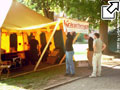 | "Kriegerherzen" auf dem Gothic Knights-Spektakel 06. September 2002 Am 06.09.2002 gingen wir mit "Kriegerherzen" zum ersten Mal live an die Öffentlichkeit: Im Rahmen des Fantasy-Spektakels "Gothic Knights - Das Erwachen" auf der Burg Satzvey bei Mechernich errichteten wir ein 5 x 5 Meter großes Promotion-Zelt. Auf dem Event waren wir in guter Gesellschaft, denn nicht nur Drehbuch und Regie der 'Gothic Knights' sind von Rainer ZIPP Fränzen, auch eine Menge Darsteller von "Kriegerherzen" wirkten bei dem Spektakel mit. Eine Art Heimspiel-Atmosphäre lag über der Burg ... Für unser Promotion-Debüt hatten wir uns mächtig ins Zeug gelegt: Ein großes Kriegerherzen-Banner war eigens für uns gefertigt worden, Flyer getextet, gesetzt und gedruckt, Presseberichte und Poster gerahmt worden. Vor und in dem mit Requisiten liebevoll dekorierten Zelt war das Promotion-Team in Kriegerherzen-T-Shirts einen ganzen Nachmittag und Abend im Einsatz. An diesem Tag konnten die Besucher nicht nur Infos aus erster Hand erhalten, sondern auf Video auch schon die brandneuen Previews begutachten. Daneben waren die Artikel aus dem Online-Shop vor Ort zu erstehen. Zeitweise platzte unser Zelt aus allen Nähten, und am Ende des Abends hatten wir nicht nur fusselige Lippen, sondern auch jede Menge Auftrieb für den weiteren Weg von "Kriegerherzen"! Einige Bilder: |
