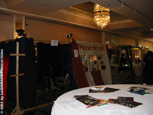 | Promotion auf der Ring*Con 2004 in Bonn 29. - 31. Oktober 2004 Zum dritten Mal hieß es im Maritim Hotel in Bonn: Ring frei zur RingCon '04! Mehr als 3000 Begeisterte zum Thema "Der Herr der Ringe" fanden sich für das Wochenende zum Monatswechsel Oktober/November ein und teilten ihre Leidenschaft für die Phantastik. Wie auch schon in den zwei Jahren zuvor war "Kriegerherzen" mit von der Partie. Während LaGARAFA Productions mit seinem festen Partner "Curzweyhl", Label für fantastische Musik, einen Stand mit Ambiente und Information darbot, konnte ein jeder sich über den aktuellen Stand von "Kriegerherzen" informieren und darüber hinaus noch von den Leuten von Cast & Crew, die am Stand vertreten waren, Antworten auf ihre Fragen erhalten. Wir freuten uns über so manches Wiedersehen nach nunmehr einem Jahr. Niemand von unserem Team hatte damit gerechnet, dass so vielen "Kriegerherzen" noch so in Erinnerung war. So konnten wir sowohl alte Freunde wiedersehen und neue dazugewinnen. Die Atmosphäre der Convention war herzlich und gelöst, so dass es auch uns mit großem Bedauern erfüllte, dass es nur drei Tage waren, die wir in Bonn verbringen durften. Als Highlight des Wochenendes (aus "Kriegerherzen"-Sicht, versteht sich) stand das Panel auf dem Plan, welches trotz der frühen Terminierung von 10 Uhr Samstag morgens gut besucht war. Es wurden viele Fragen an uns gestellt, die wir nach Möglichkeit auch beantwortet haben. Und als besonderes Dankeschön an alle durften wir dort die erste Vorabfassung für das Making-Of auf der großen Leinwand spielen lassen. Zudem gab es noch das Musikvideo "Warriorhearts" in voller Länge (9.24 min!) zu sehen und das Label "Curzweyhl" hat uns gestattet, den Videoclip "Egil Saga" von der Gruppe Faun vorzuführen. Bei diesem aufwändigen Musikvideo hat LaGARAFA Productions zusammen mit einigen Crewmitgliedern von "Kriegerherzen" ebenfalls tatkräftig mitgewirkt.Es war ein besonderes und phantastisches Wochenende für uns und wir freuen uns bereits auf das nächste Jahr! Einige Bilder: folgen bald... |